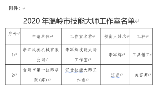 我司根據《關于深入實施2020年度溫嶺市技能大師工作室項目建設及考核評估的通知》(溫人社發(fā)〔2020〕59號)文件精神,通過自行推薦以及地方政府的大力支持,充分準備了相關申報資料,通過主管部門的初審以及專家的評審、部門審議和社會公示等評選環(huán)節(jié),我司最終順利通過評審,被評定為“李軍輝技能大師工作室”并于政府平臺公示。